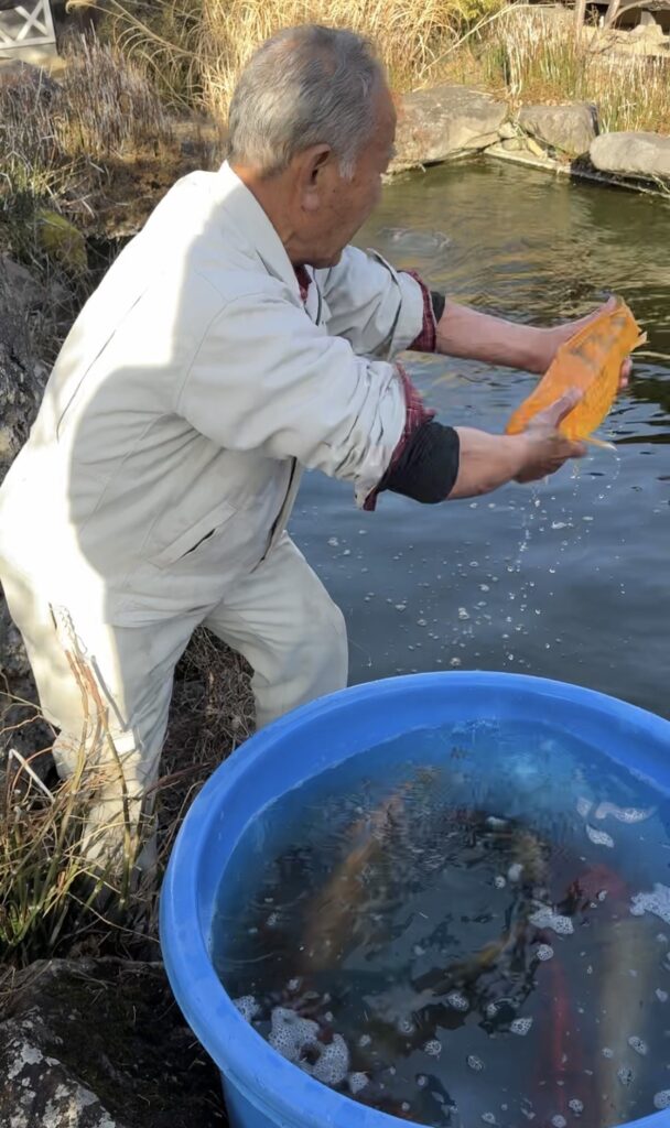 東京都内で錦鯉を運搬して下さる業者さんが見つからず、小諸市で錦鯉販売を専門にしている宮本さんに東京ー東御を往復してもらいました。宮本さんは御年85歳、母親とほぼ同じ歳の宮本さんに往復運転してもらい、重い鯉を網ですくい、500リットル程ある容器に移して、東御に移動させ、車から池に放つ作業を20往復しなくてはならない。はじめは大丈夫だろうかと心配になったが、さすが現役で養鯉所を営む宮本さん、足腰の安定感と無駄のない動き、さすがプロの仕事です。老人扱いして申し訳ない。私のほうがよほど足元が危ない。恥ずかしい限りである。